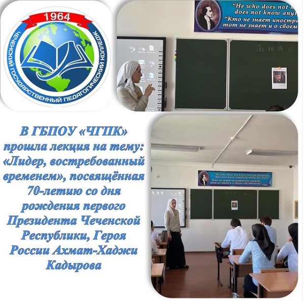 15.06.2021В группе 19-ИСиП-2д преподаватель Магомадова Э.И., провела лекцию на тему «Лидер, востребованный временем» , посвящённую 70-летию со дня рождения Первого Президента Чеченской Республики,Героя России Ахмат-Хаджи Кадырова . В лекции говорилось о том, что одной из его первоочередных целей состояла в том , чтобы восстановить и обеспечить функционирование , развитие образовательной системы Чеченской Республики. И эта цель с успехом достигнута. «Знание - главная сила современного общества» - так говорил Ахмат-Хаджи Кадыров!