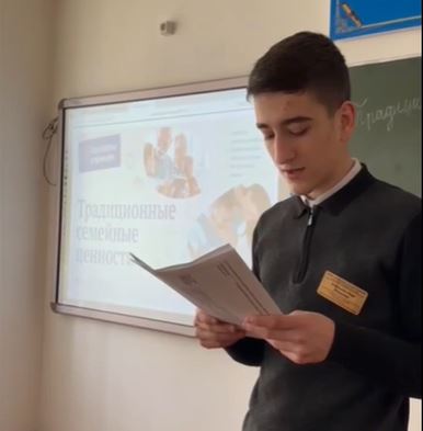 28.02.202327 февраля 2023г. в рамках проекта «Разговоры о важном Мумаева Петимат Рамазановна и Сапиев Хасанбек Абумуслимович провели занятие по теме: «Традиционные семейные ценности». Студенты вспоминали историю возникновения праздника, знакомились с традиционными семейными ценностями, преемственности поколений, взаимоуважения и взаимопомощи в семье, рождения и воспитания детей. В возведение итогов занятия студенты приняли участие в флешмобе «Спасибо, мама!»