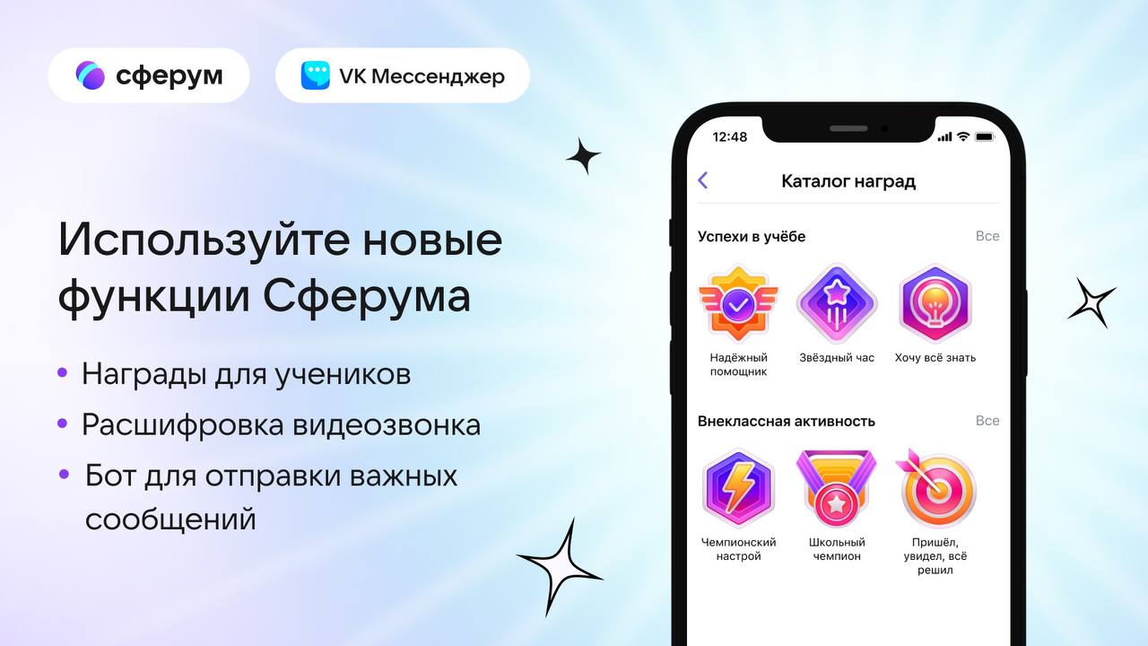 12.01.2024Сферум представил новые функции для педагогов, родителей и учащихся. В учебном профиле Сферум в VK Мессенджере появился раздел «Награды», благодаря которому педагоги смогут мотивировать и поощрять школьников за достижения в учебе, спорте и внеучебной деятельности.