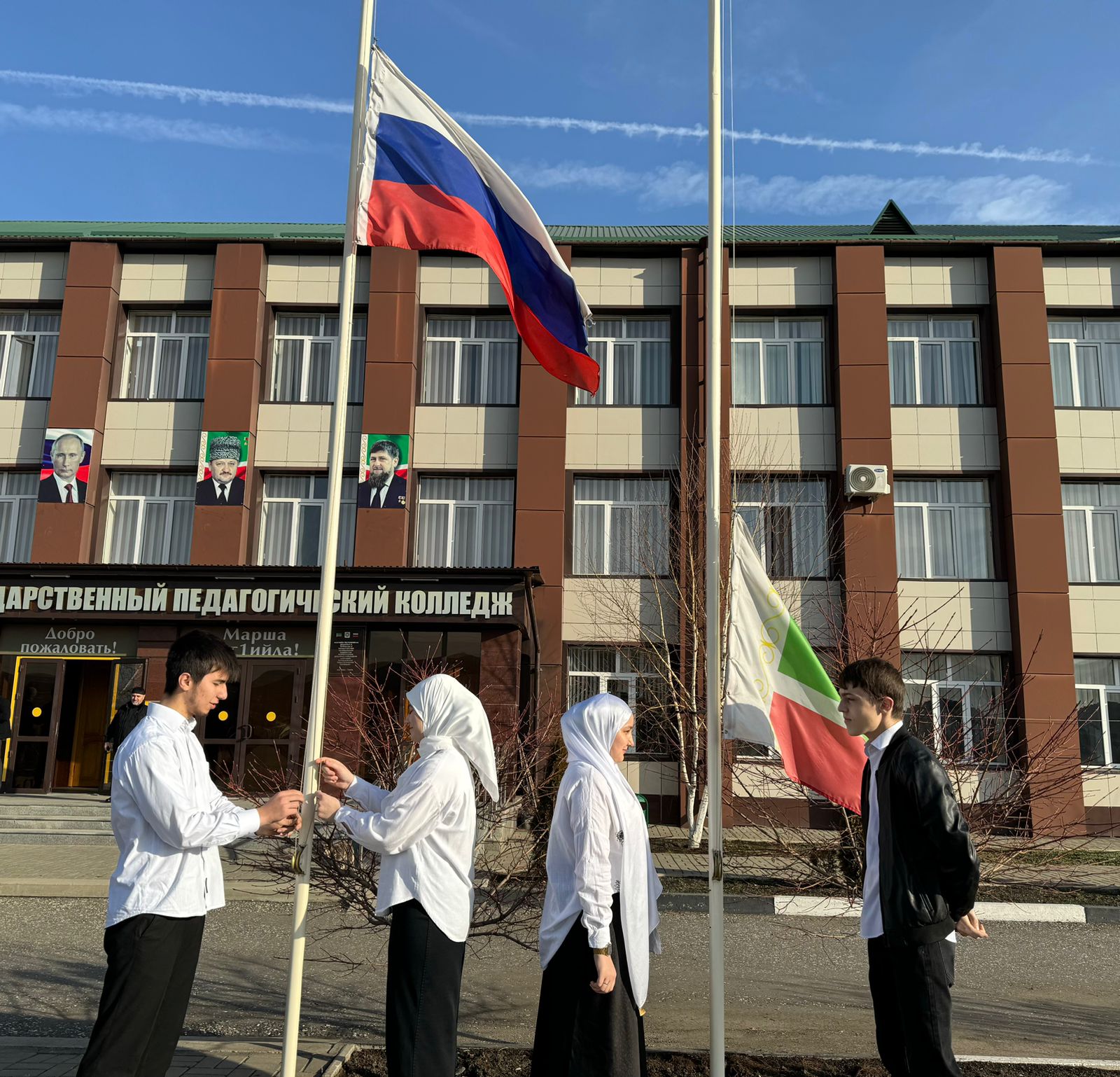 Перед началом кураторских часов в ЧГПК состоялось традиционная торжественная церемония поднятия государственных флагов Российской Федерации и Чеченской Республики, после которой в образовательном учреждении стартует учебная неделя.