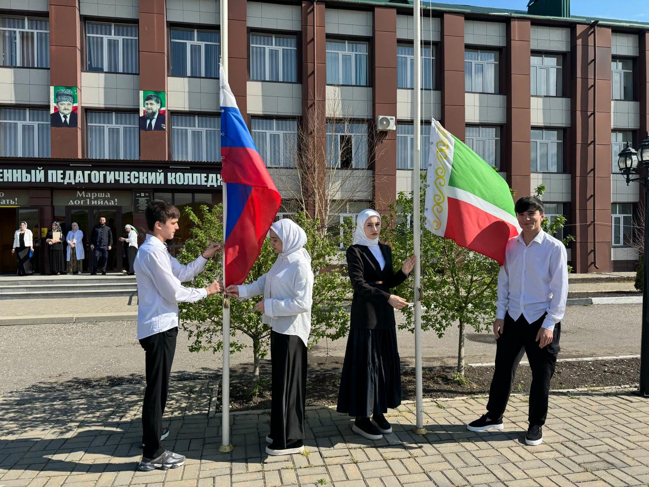15.04.2024После грандиозных праздничных дней с окончанием священного месяца Рамадан (Ид аль-Фитр) учебная неделя Чеченском государственном педагогическом колледже началась торжественной линейкой и церемонией поднятия государственных флагов Российской Федерации и Чеченской Республики.
