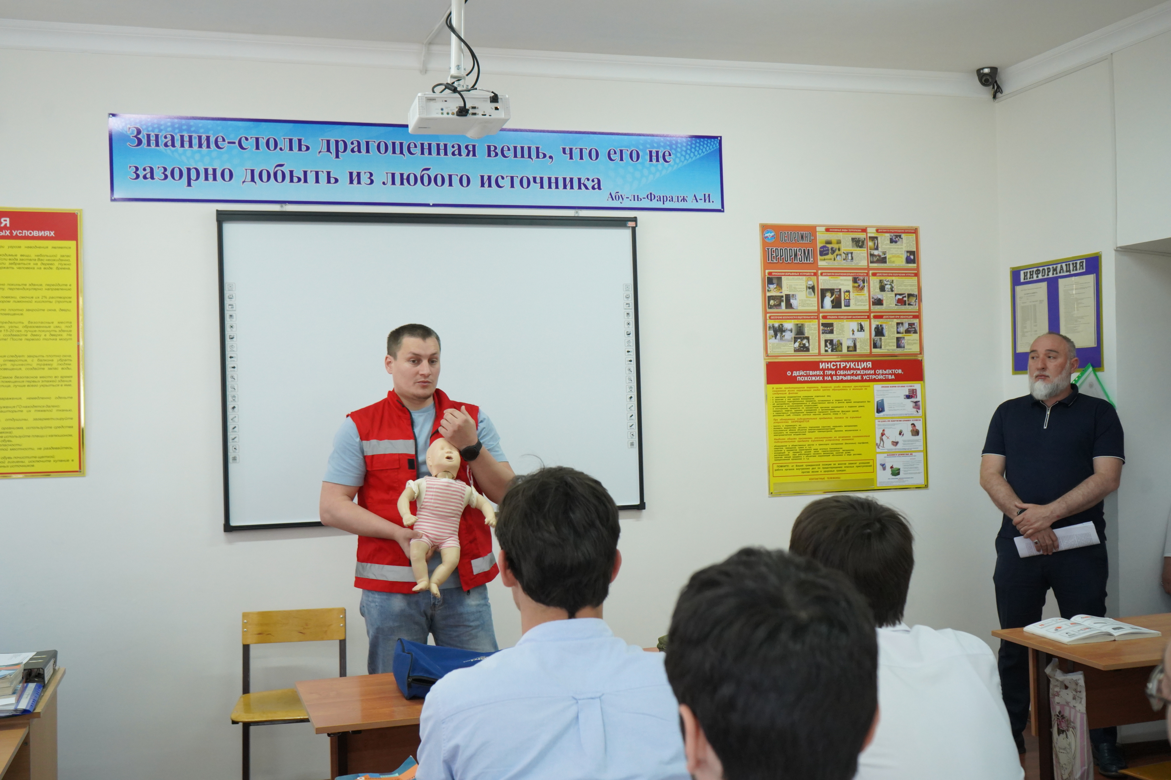 Кроме того, Х. Захираев показал, как правильно укладывать человека при эпилепсии, а также накладывать жгут для остановки венозного и артериального кровотечения во время несчастных случаев.