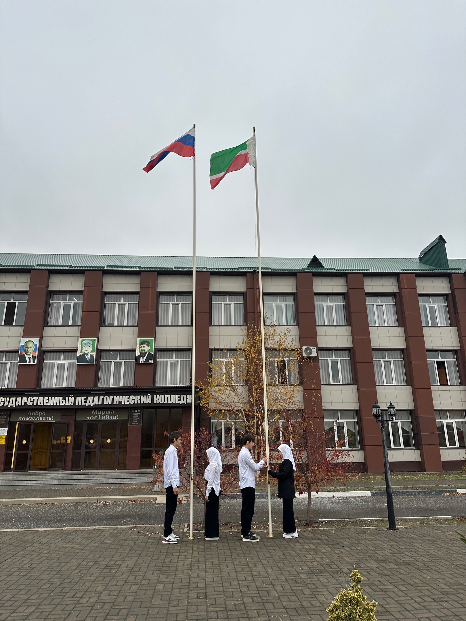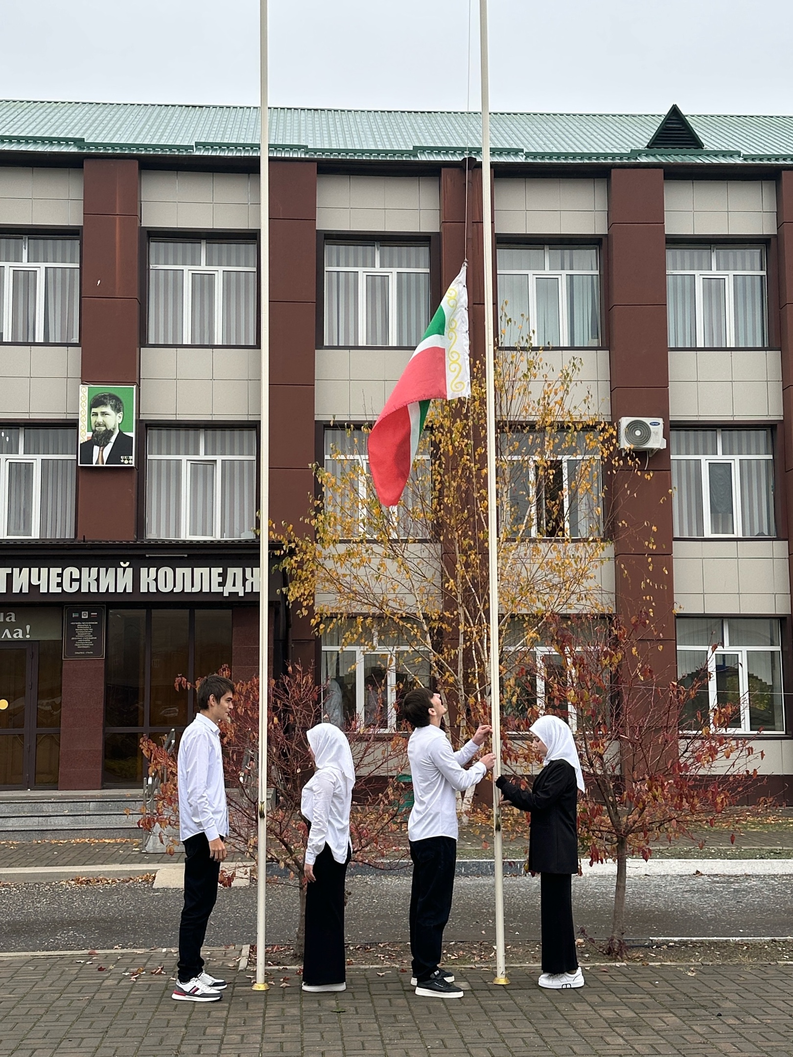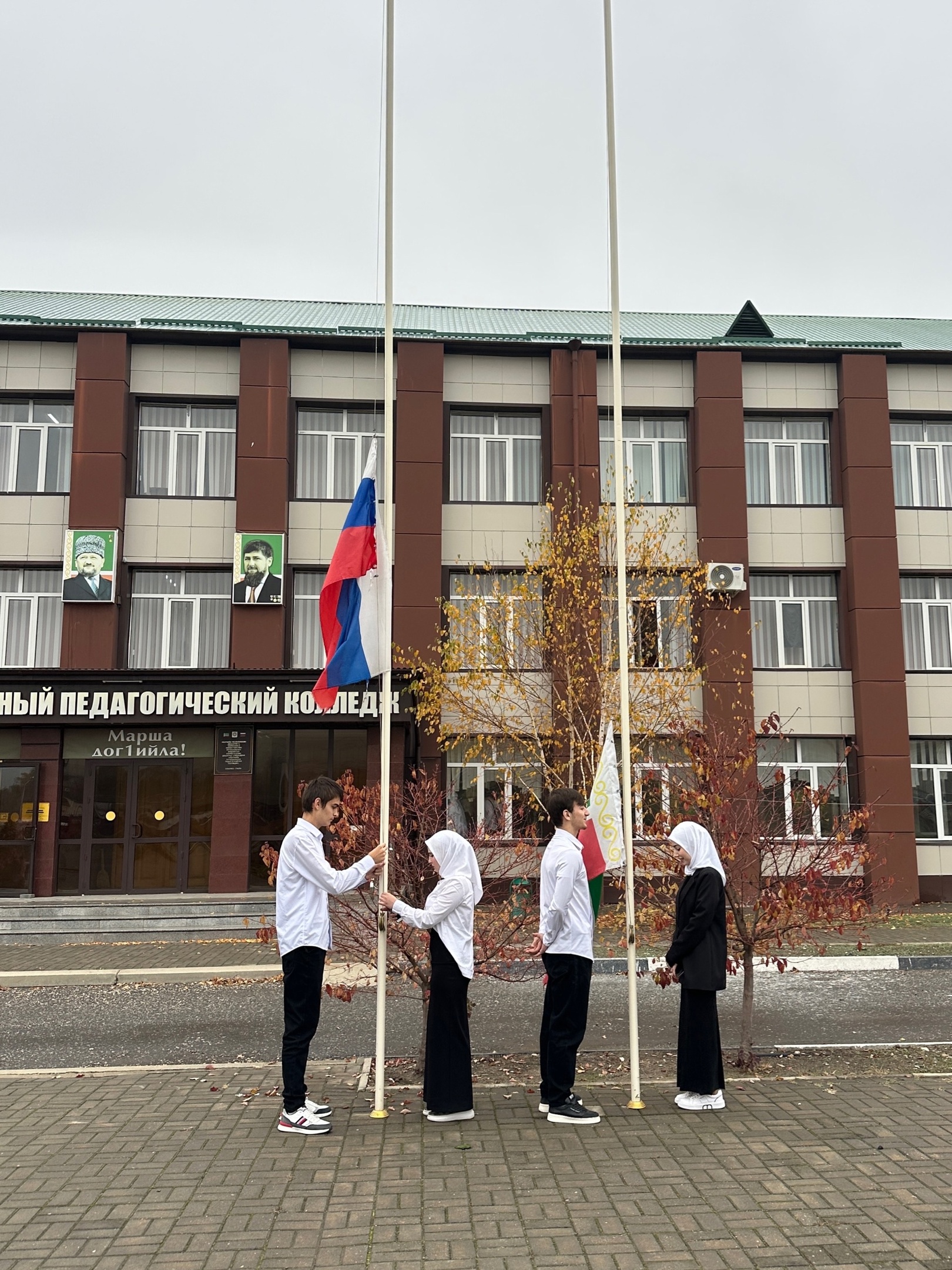 В Чеченском педагогическом колледже прошла торжественная церемония поднятия государственных флагов под гимны Российской Федерации и Чеченской Республики.