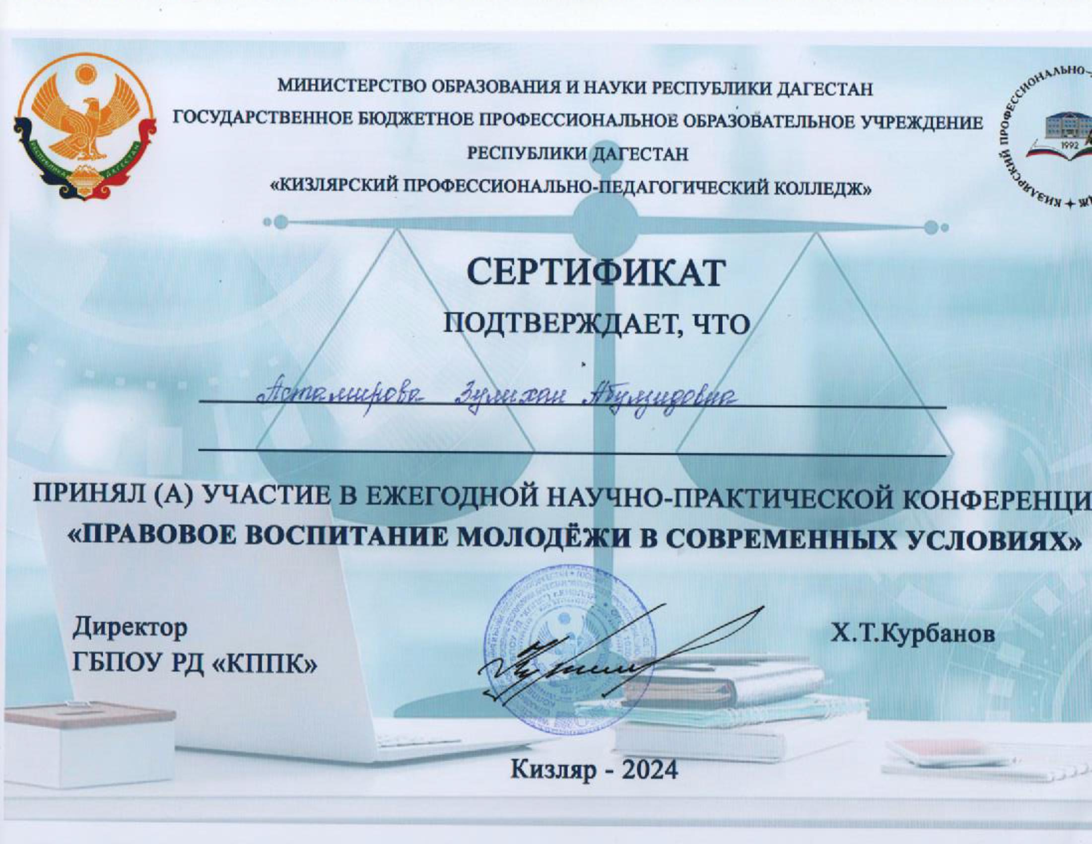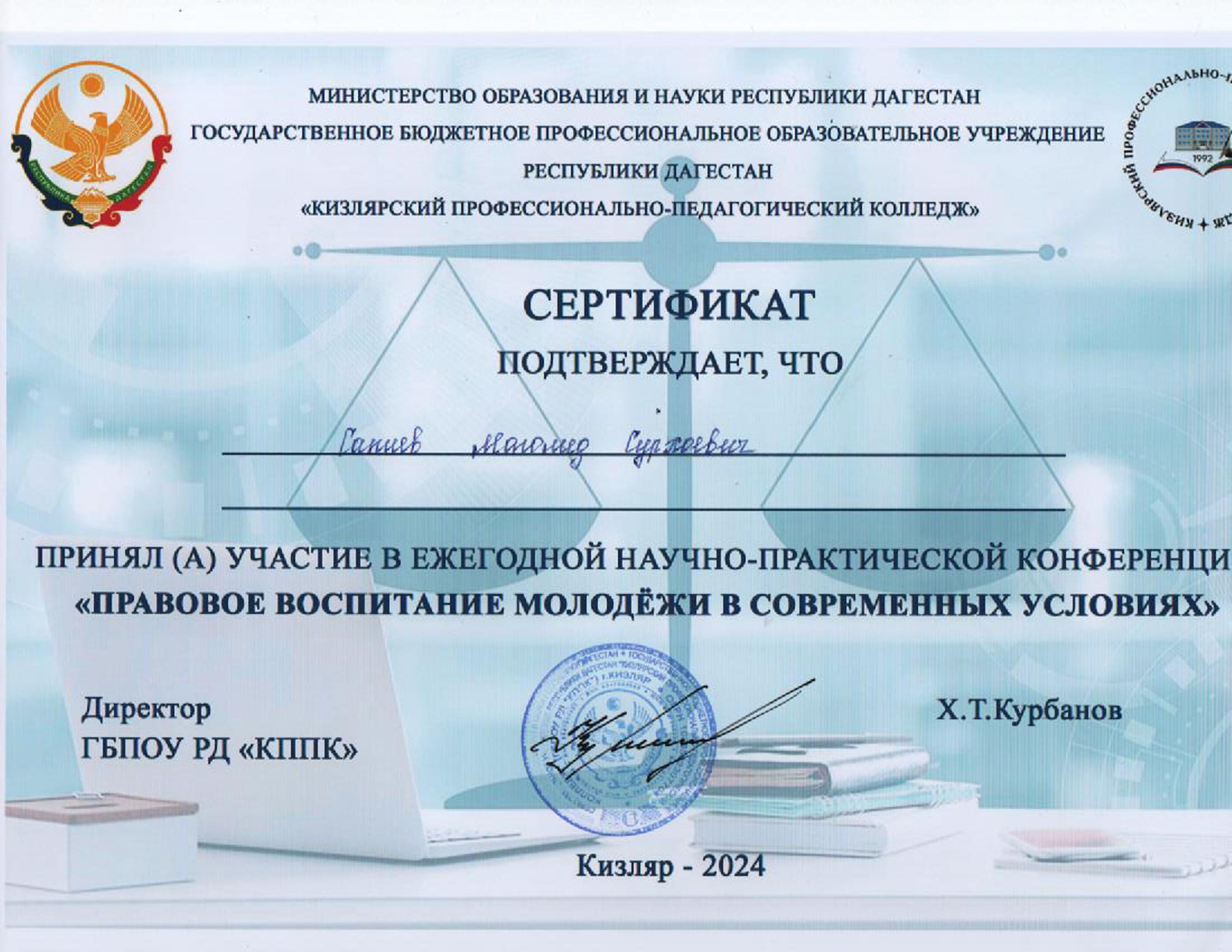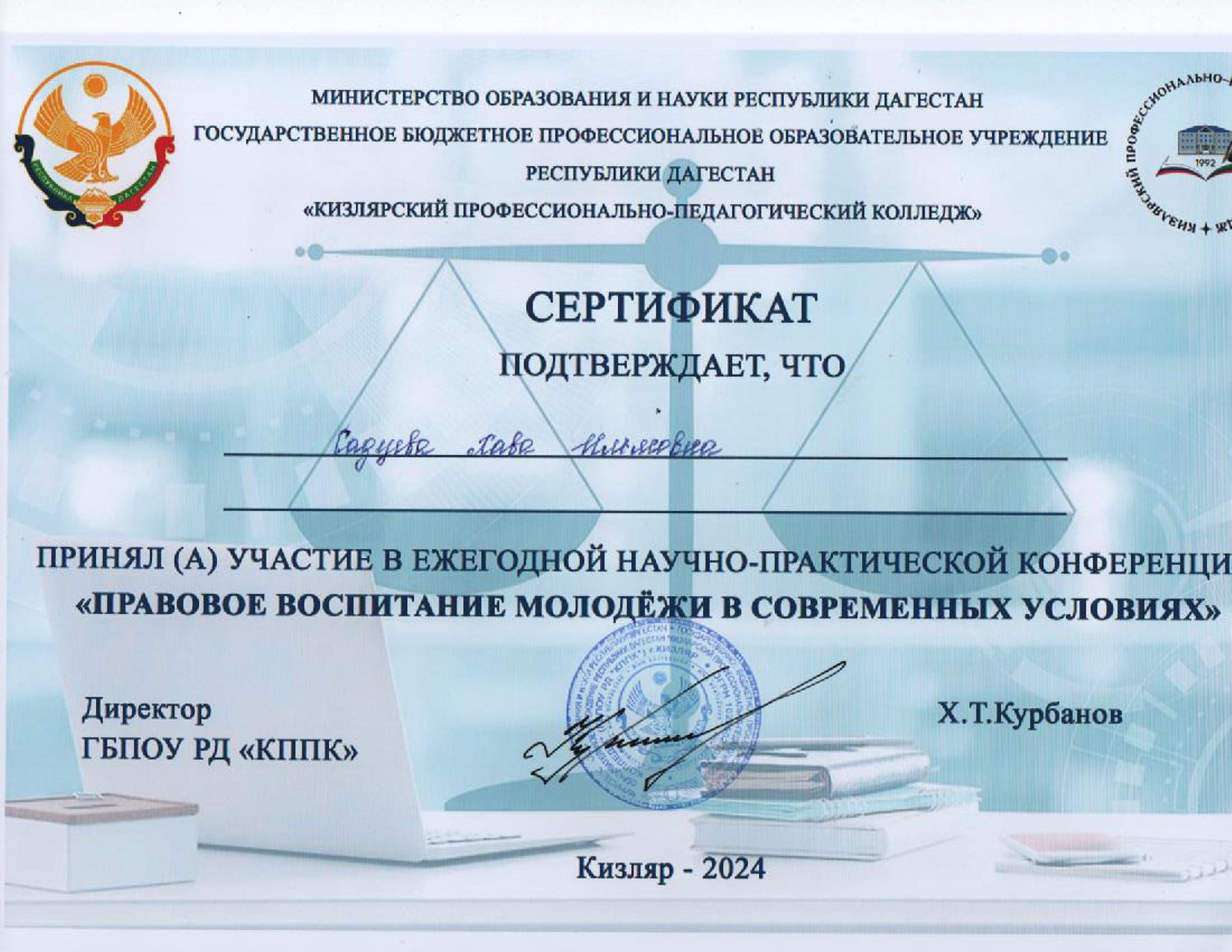 19.11.20249 ноября 2024 г. на базе Кизлярского профессионально-педагогического колледжа состоялась ежегодная Республиканская научно-практическая конференция на тему: «Правовое воспитание молодёжи в современных условиях».