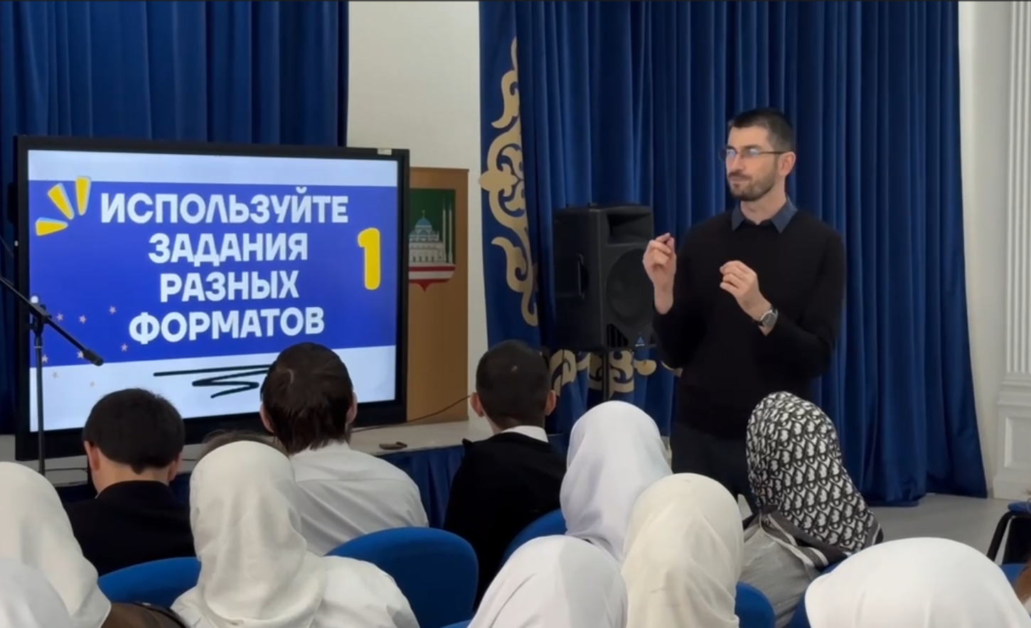 В ходе мастер-класса Алихан Мавладиевич поделился с будущими педагогами опытом внедрения инновационных методик в образовательный процесс. Он продемонстрировал, как привычные викторины и тесты можно преобразовать в увлекательное интерактивное пространство, где каждый студент становится активным участником обучения.