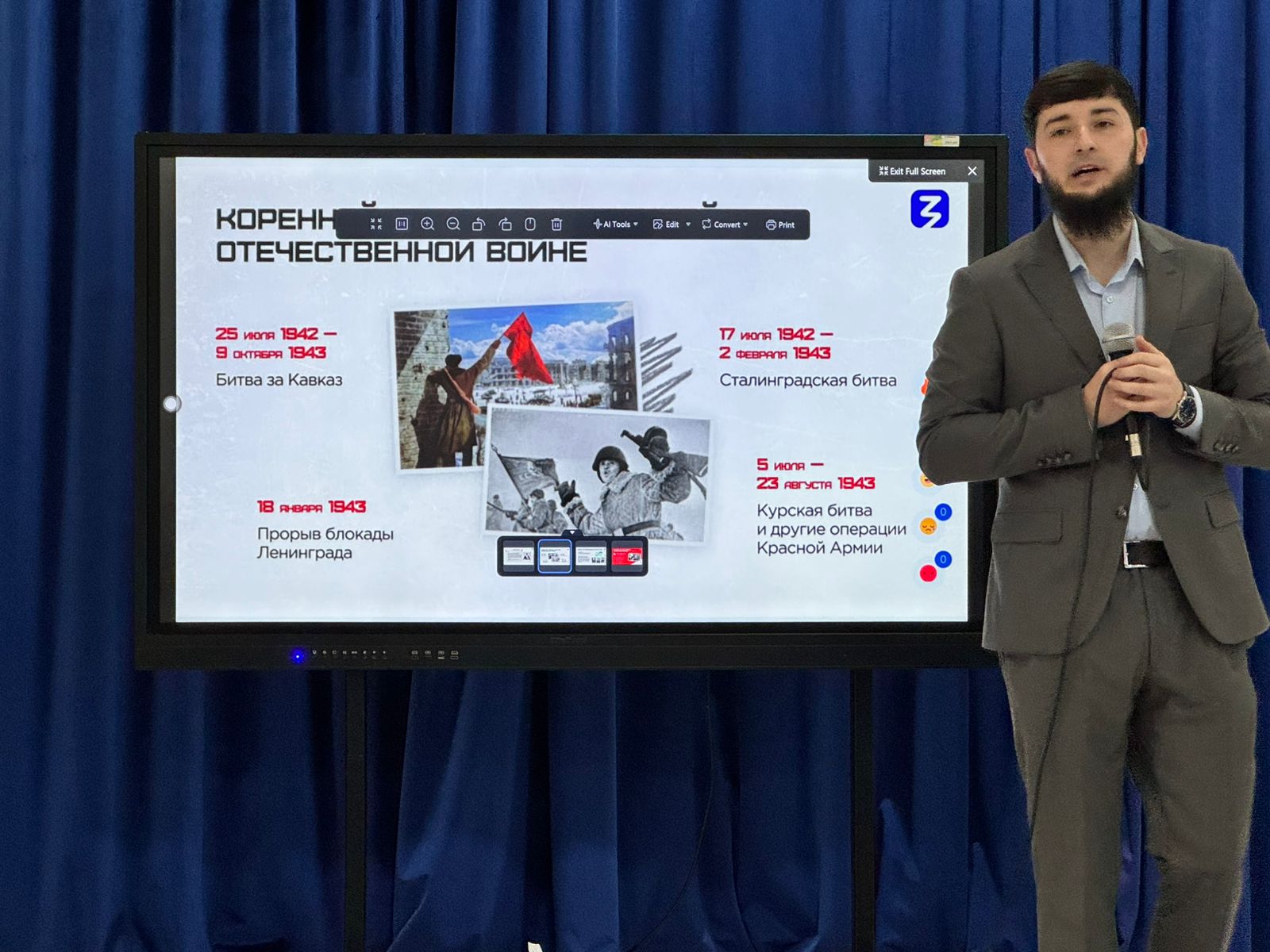 Мероприятие было организовано при поддержке Российского общества «Знание». Перед студентами выступил заместитель директора по воспитательной работе Грозненского педагогического колледжа, лектор общества «Знание» Ислам Зайндиевич Муслимов. Его лекция стала для будущих педагогов глубоким и эмоциональным погружением в события тех лет.